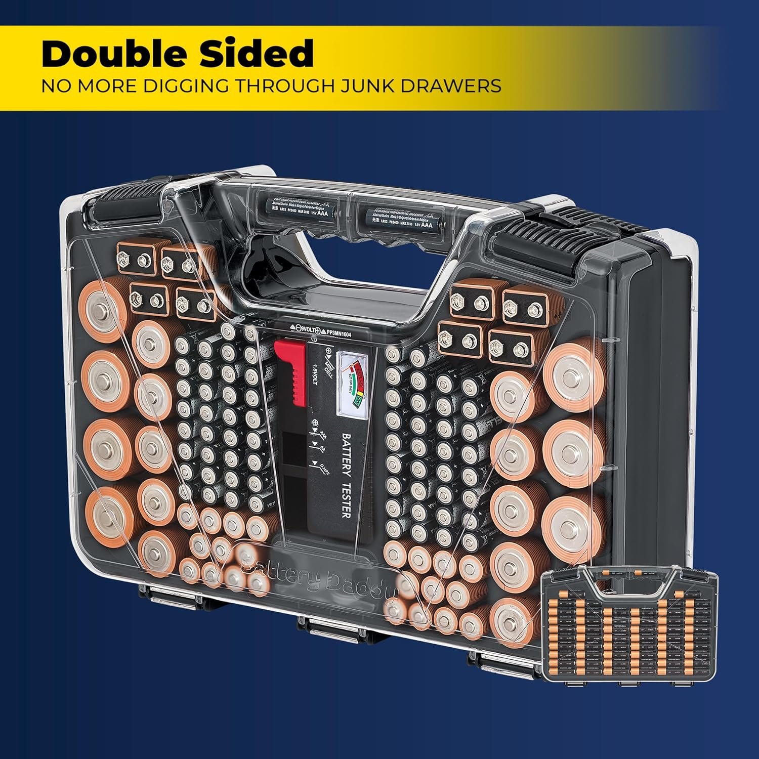 • Double-Sided Design: This model uses both sides to maximize storage space and organization, holding up to 180 batteries in labeled compartments. The clear locking lid gives you a quick inventory check at a glance.