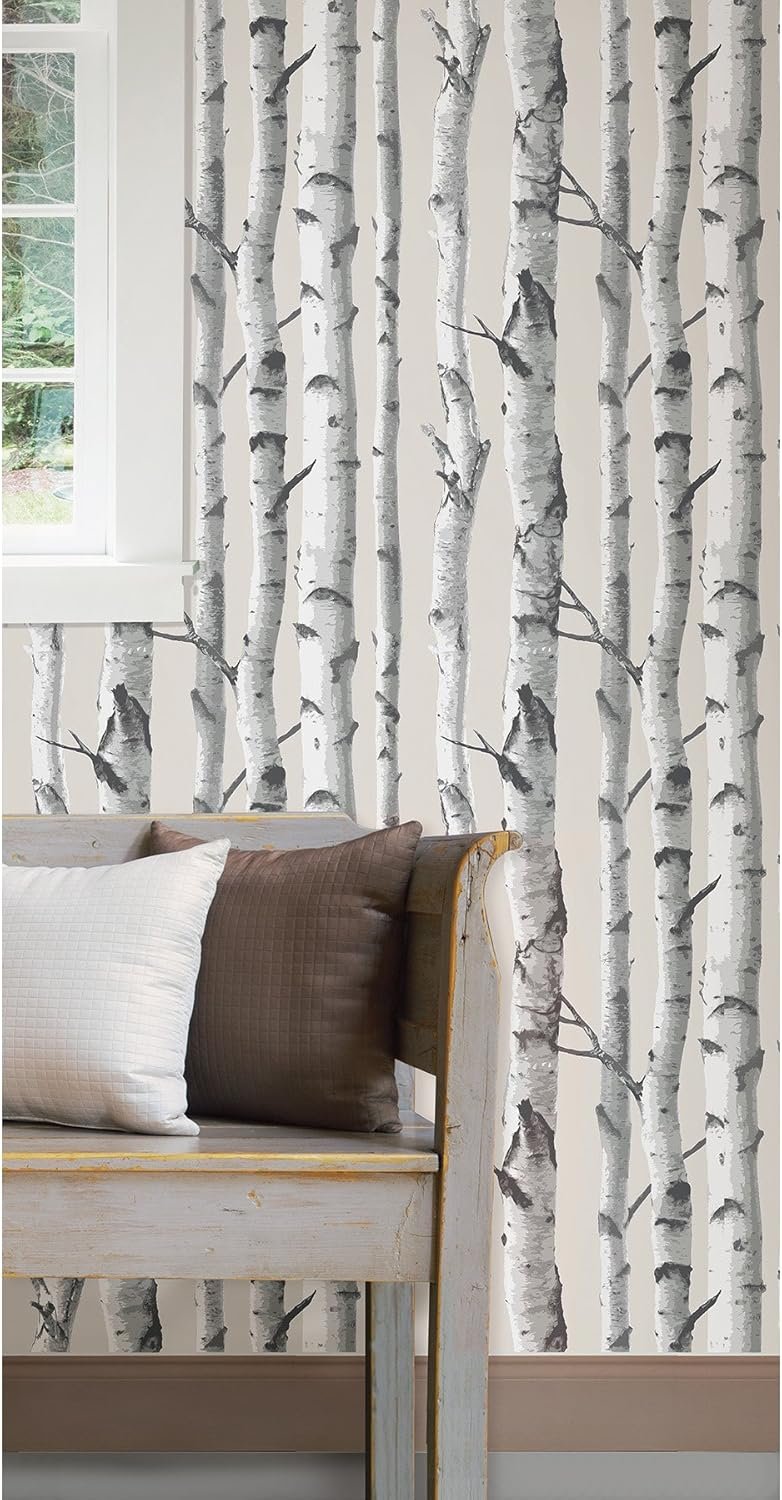 Transform your space effortlessly with the NuWallpaper NU3128 Birch Tree Peel & Stick Wallpaper from the NuWallpaper Store. Featuring a chic birch tree design, this wallpaper is easy to apply and remove without damaging surfaces or leaving sticky residue. Perfect for rentals and DIY projects, it adheres to any smooth, flat surface and is easily repositionable during installation. Each roll covers about 30.75 sq. ft., making your home refresh both simple and stylish.