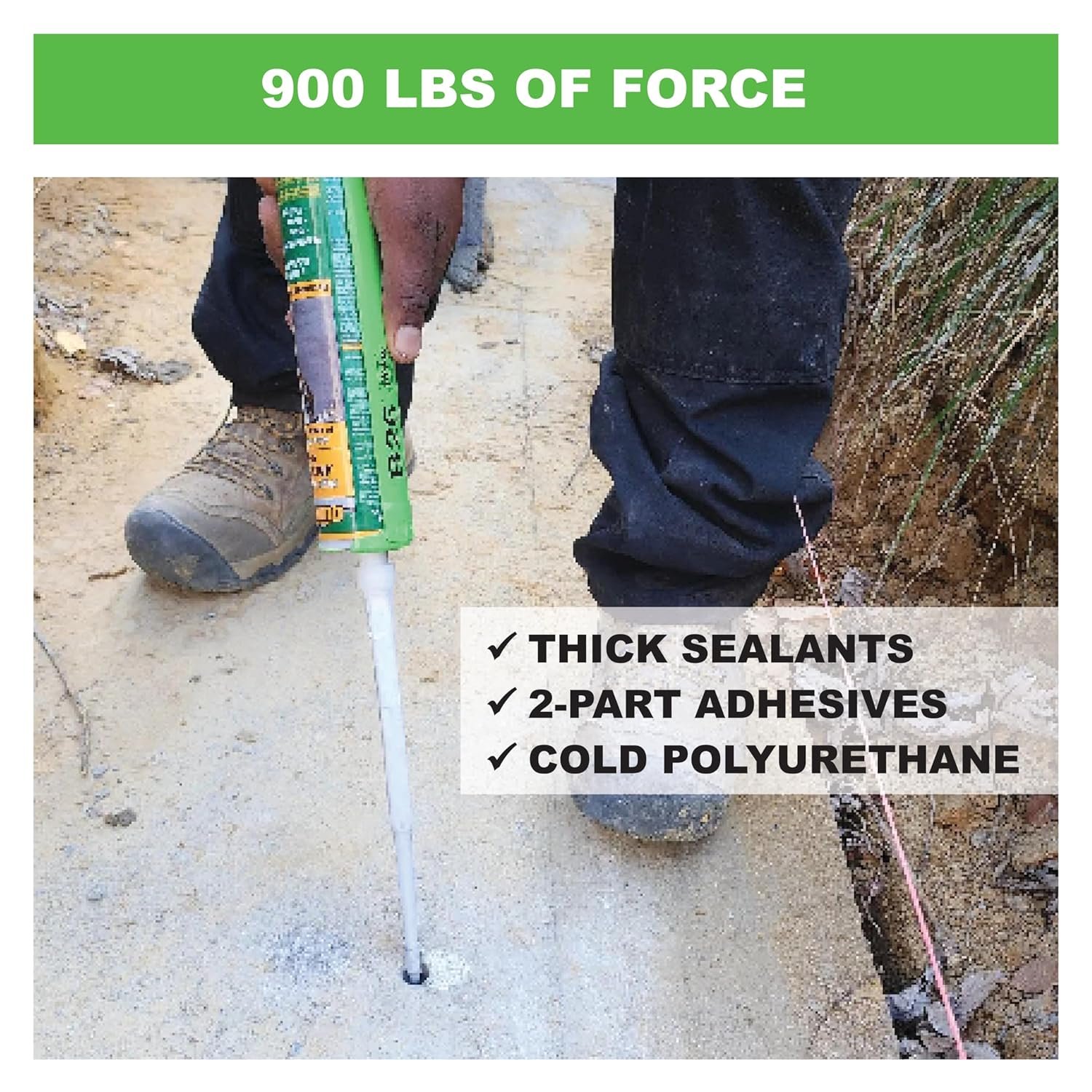 This caulking gun provides far more thrust force (900 lbf vs typical 250–300 lbf), extended tool life, and greater control—making it the preferred upgrade for professionals working with difficult materials.