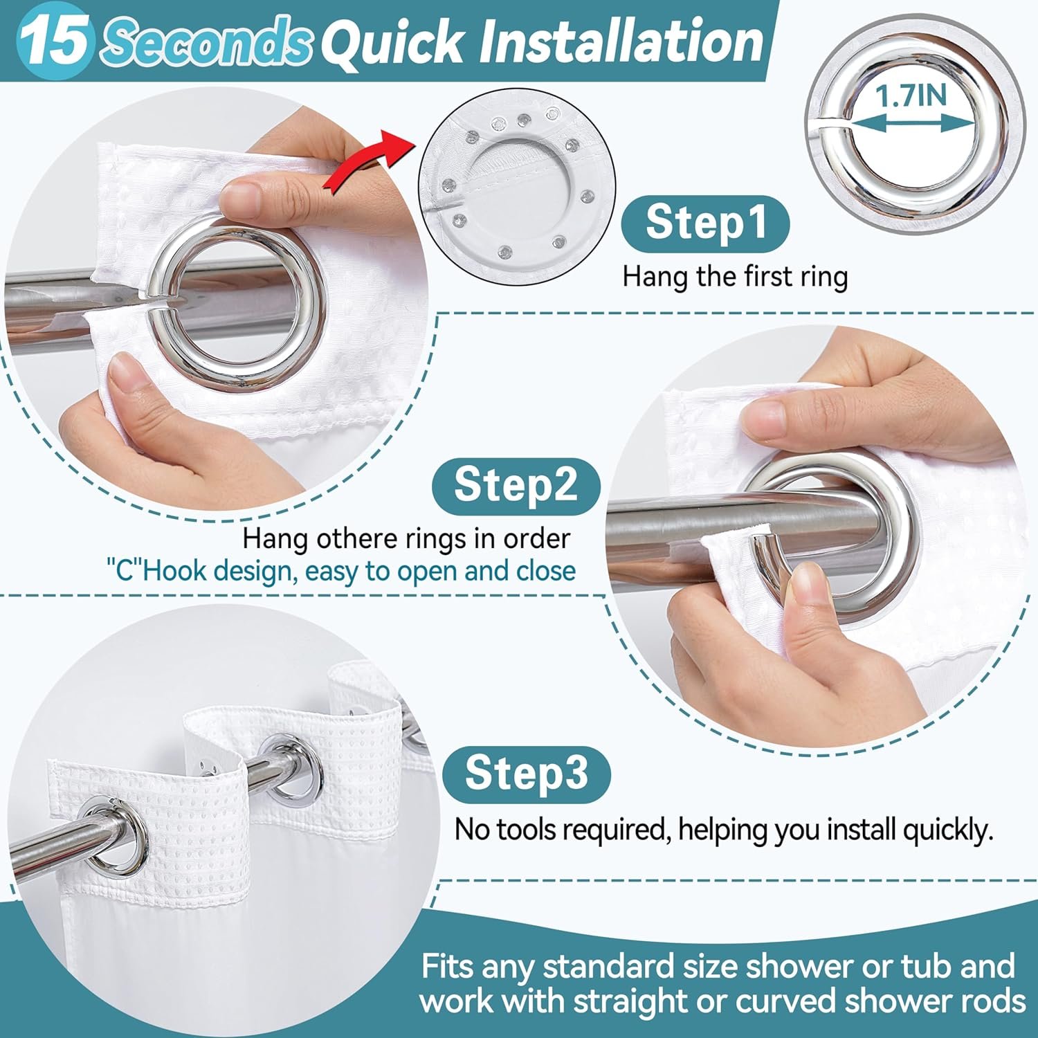 - Quality Materials: Crafted from a polyester shower liner fabric that’s waterproof, heat-resistant, and anti-wrinkle—ensuring long-lasting use and a quick dry curtain experience.