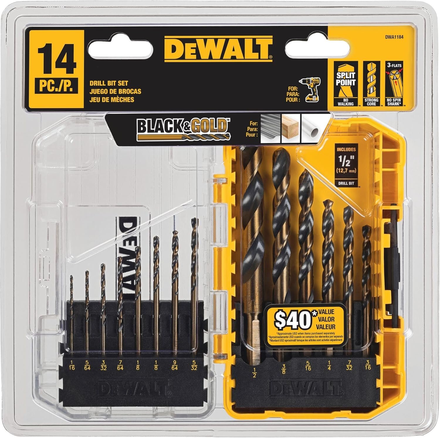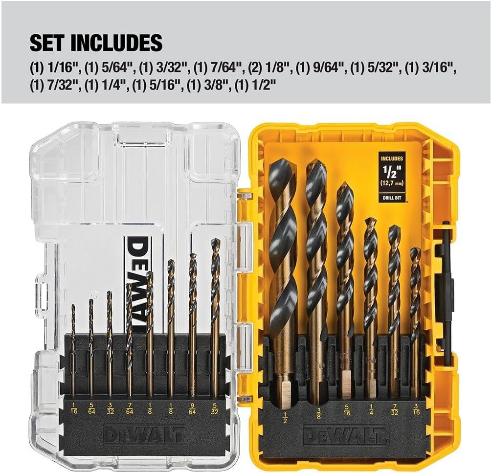 The drill bits from DEWALT, specifically the 14-piece DWA1184 set, are designed to deliver professional results for wood, metal, and plastic drilling projects of all types. Featuring a 135-degree split point and black and gold coating, this tool immediately stands out for its durability and versatility in daily shop and home tasks.