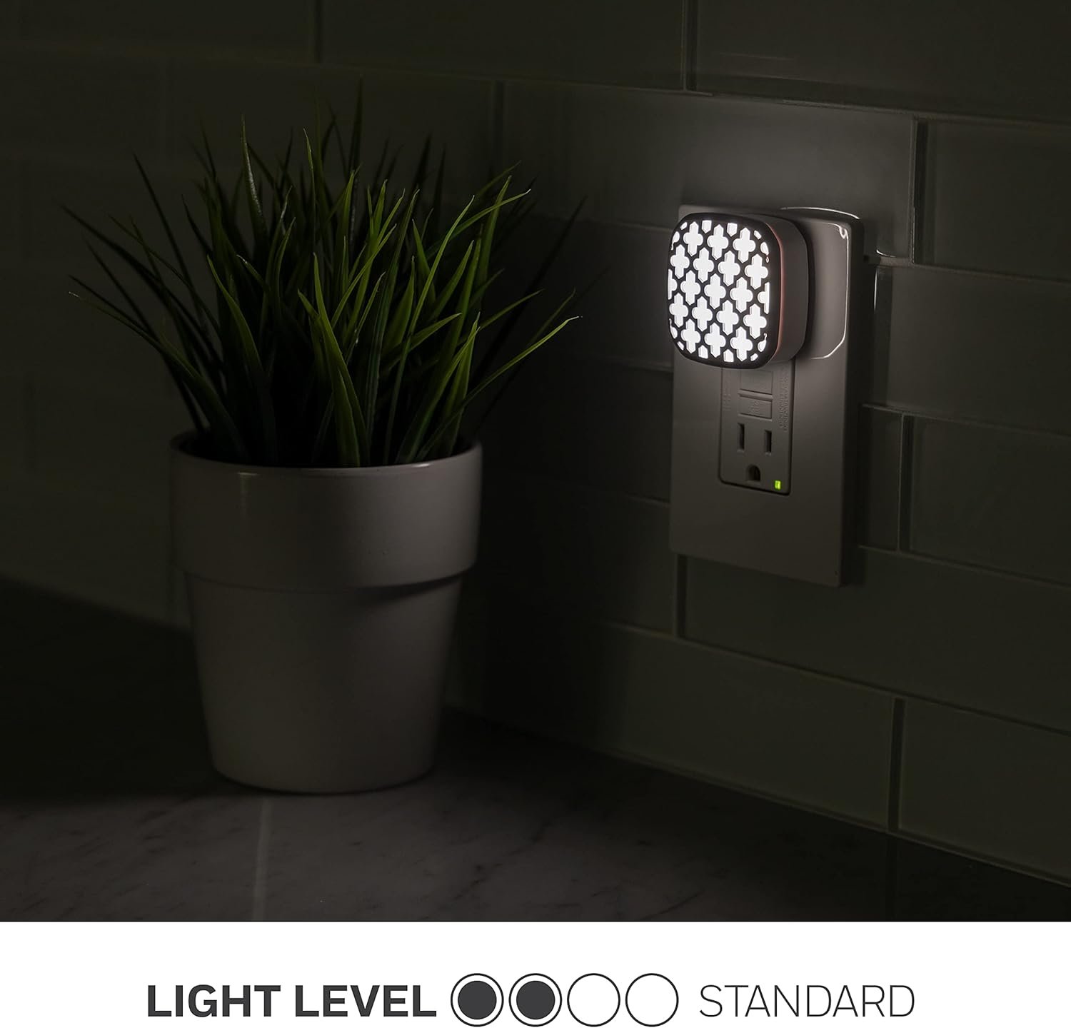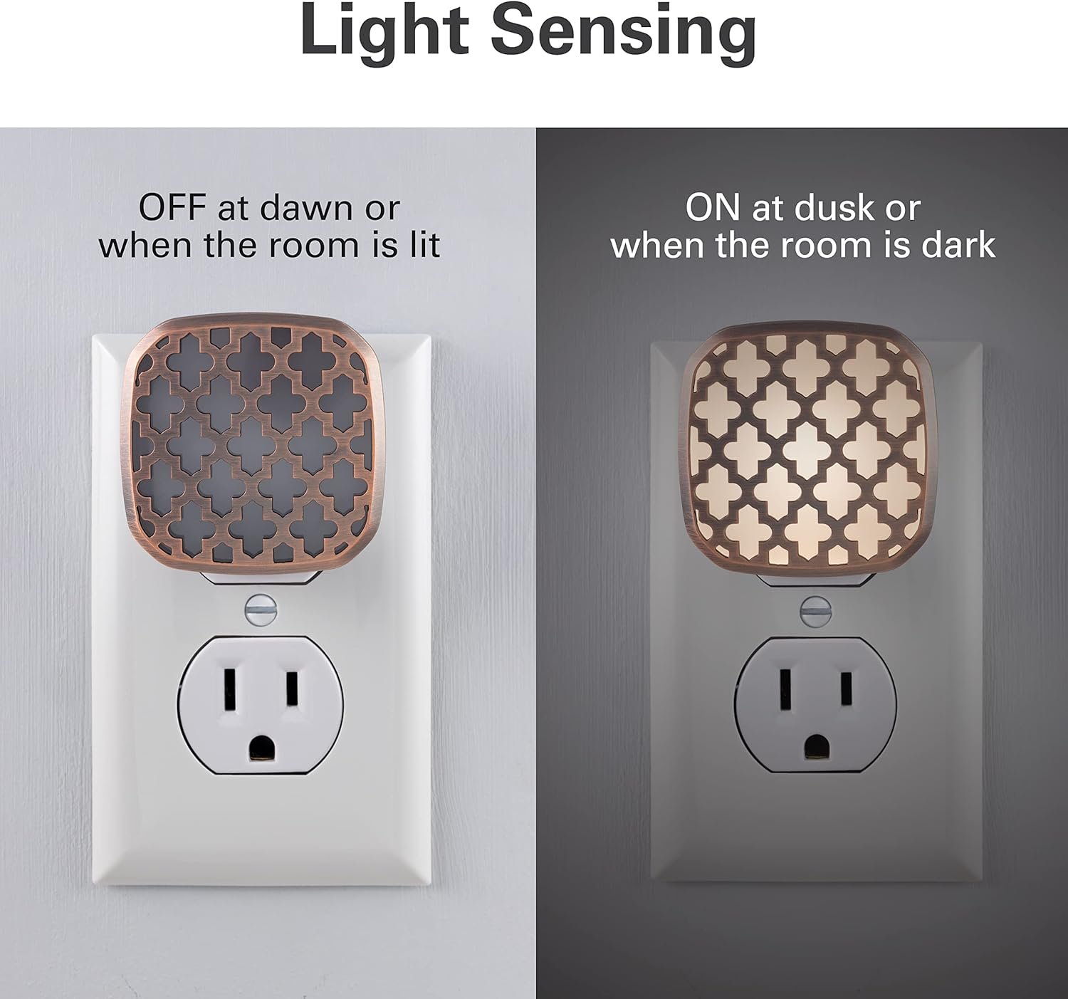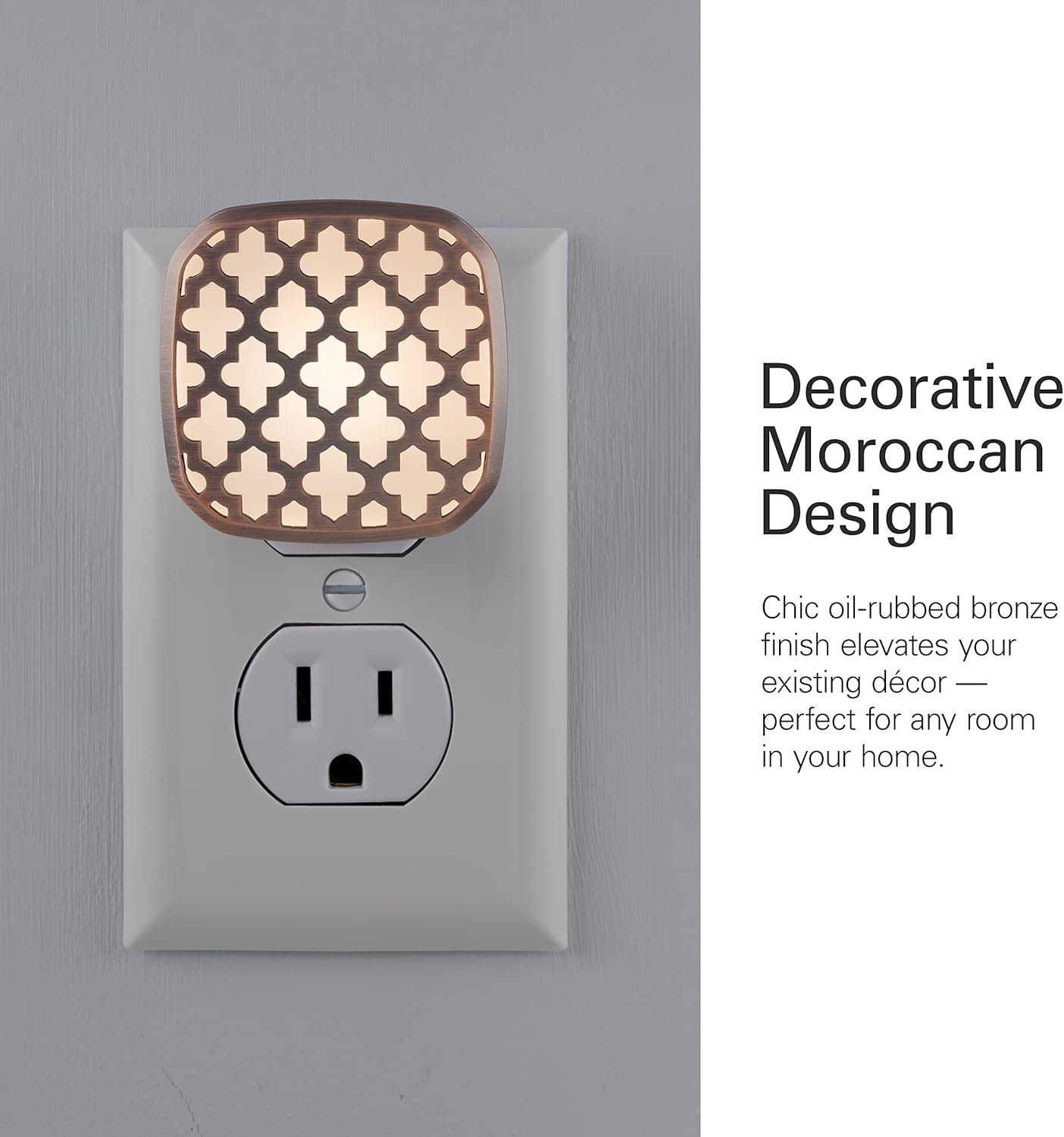 Enhance your home decor with the Lights by Night Decorative LED Night Light, featuring a stunning oil-rubbed bronze Moroccan design and practical dusk-to-dawn sensor for automatic illumination. Compact and energy efficient, this plug-in night light saves space by using only half of your outlet while providing reliable, cost-saving LED lighting. UL-certified and built to last, it's the perfect addition to bedrooms, bathrooms, kitchens, or hallways. Upgrade your interior effortlessly with this gorgeous and functional two-pack from Lights By Night.