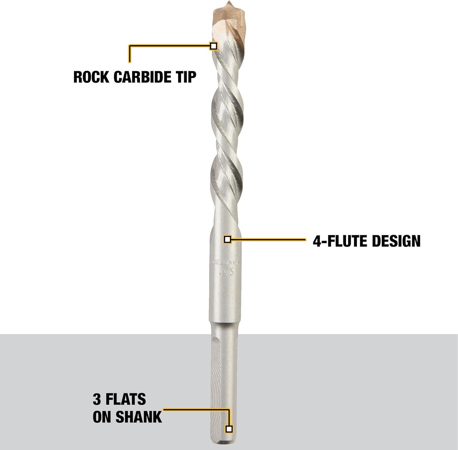 Upgrade your toolkit with the DEWALT Masonry Drill Bit Set, Percussion, Concrete & Block, 7-Piece (DW5207) from the trusted DEWALT brand. Featuring a durable 2-cutter carbide tip for extended bit life and a four-flute design for fast, efficient debris removal, this set makes drilling into concrete and block effortless. The three-flat shank prevents slipping in the chuck, ensuring reliable performance with every use. Perfect for both DIY enthusiasts and professionals, this bit set delivers the quality and durability DEWALT is known for.