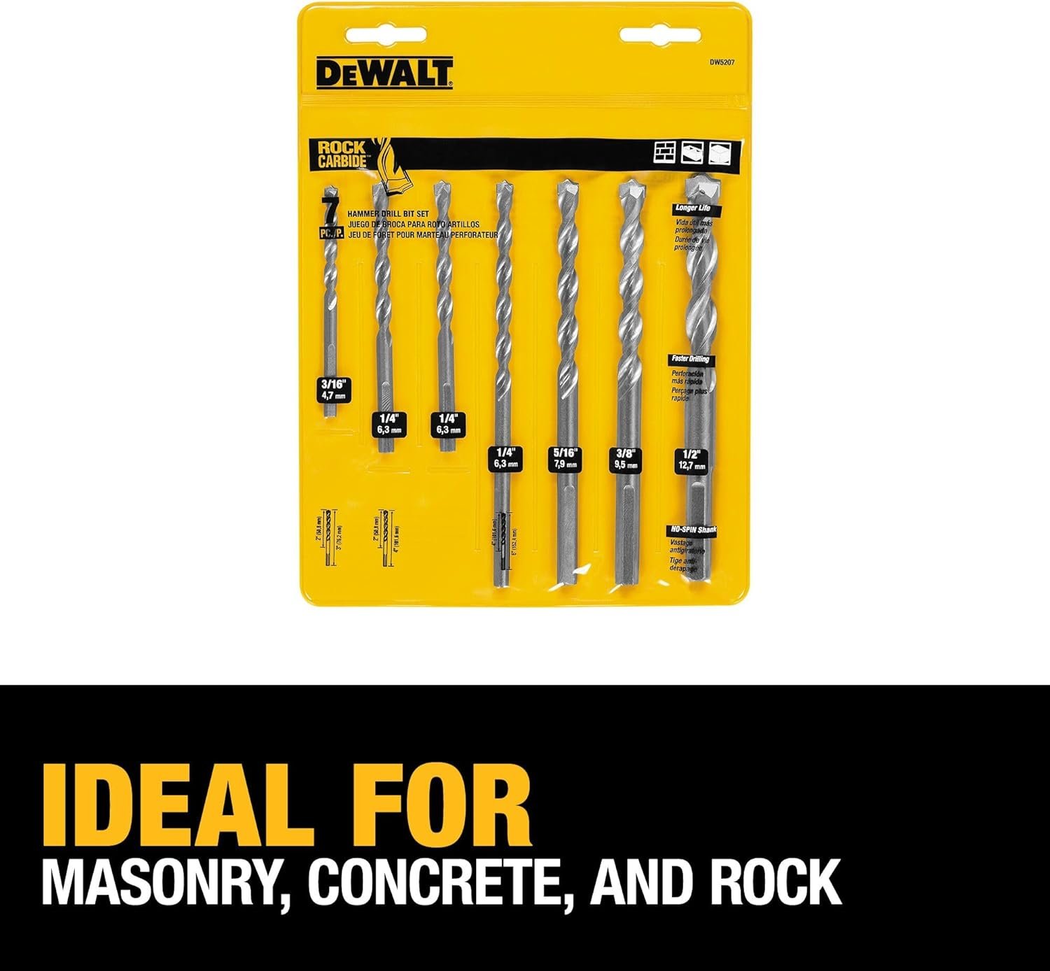 Designed for block, concrete, and brick, it features a combination of durability and efficient drilling. The included percussion drill bits are optimized for various masonry tasks. With its versatile seven-piece drill bit set, DEWALT makes it easy to tackle a range of home renovation or construction projects.