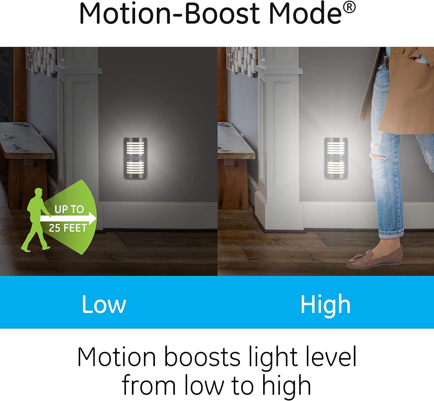 - Motion-Select Modes: With two selectable settings, users can choose Motion-Boost (low at dusk, bright on movement) or Motion-Activated (full brightness only on movement), supporting both automatic night light and plug-in nightlight preferences.