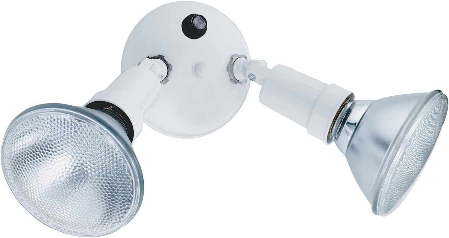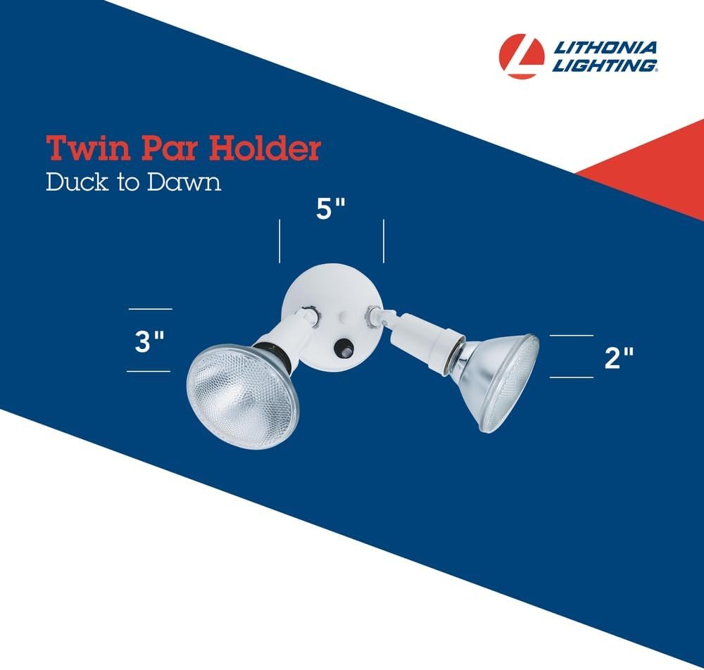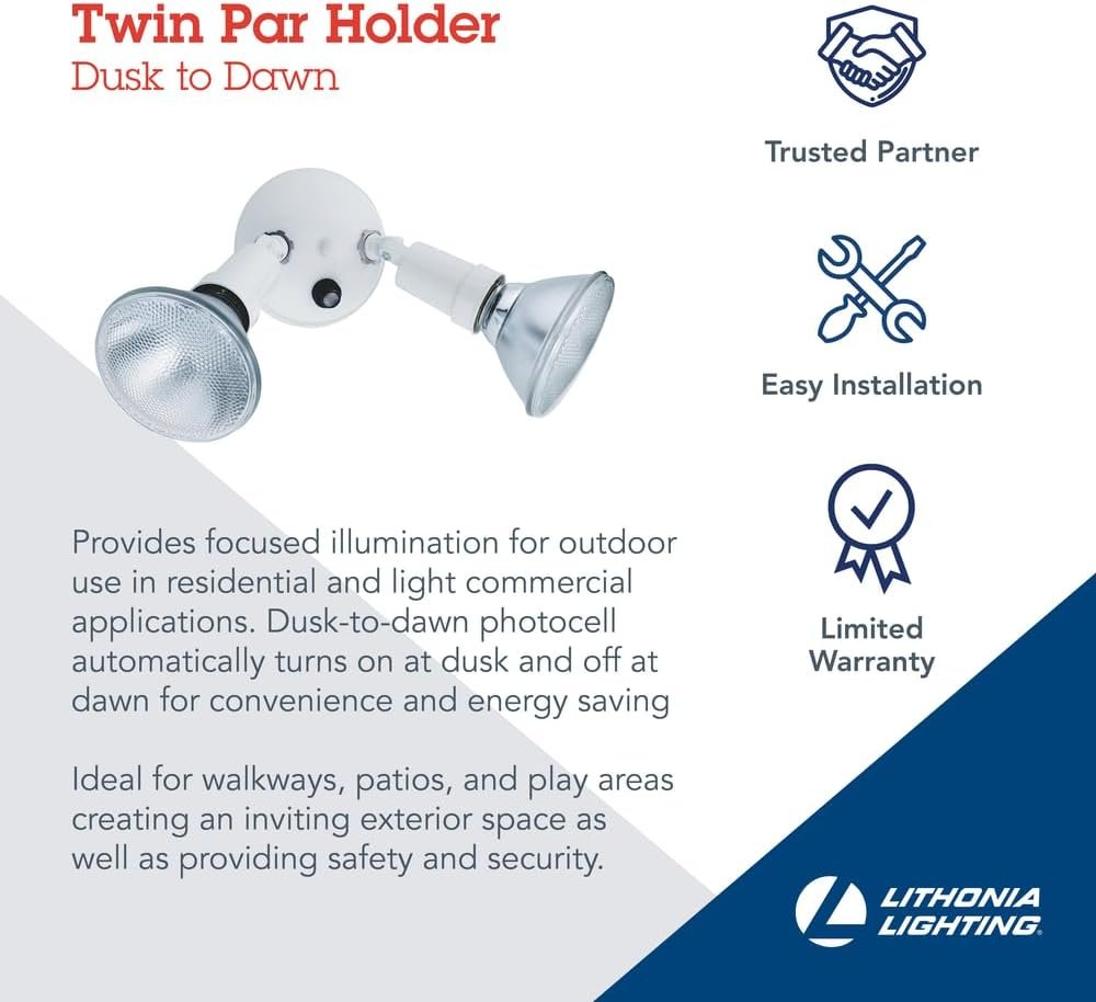 The Lithonia Lighting Adjustable Dusk Dawn Security Light is a versatile twin-par outdoor flood light holder designed to enhance safety and visibility around your home or business. With its built-in photocell sensor, this light automatically turns on at dusk and off at dawn, offering both convenience and energy savings. Its rugged, weather-resistant construction and fully adjustable heads ensure reliable, customizable illumination in any outdoor space. Perfect for driveways, patios, and more, this CUL-listed fixture from Lithonia Lighting is easy to install and built to last.
