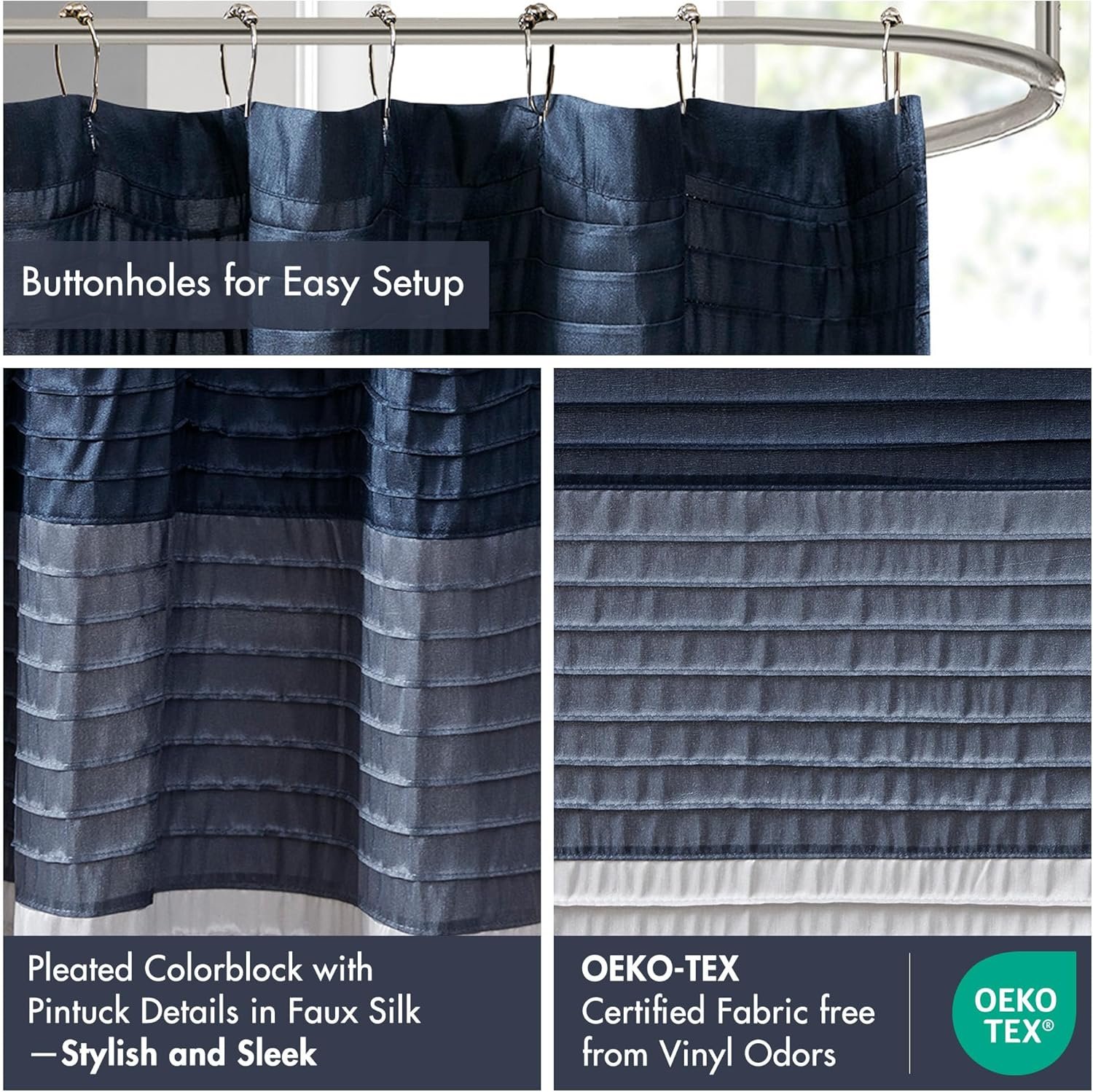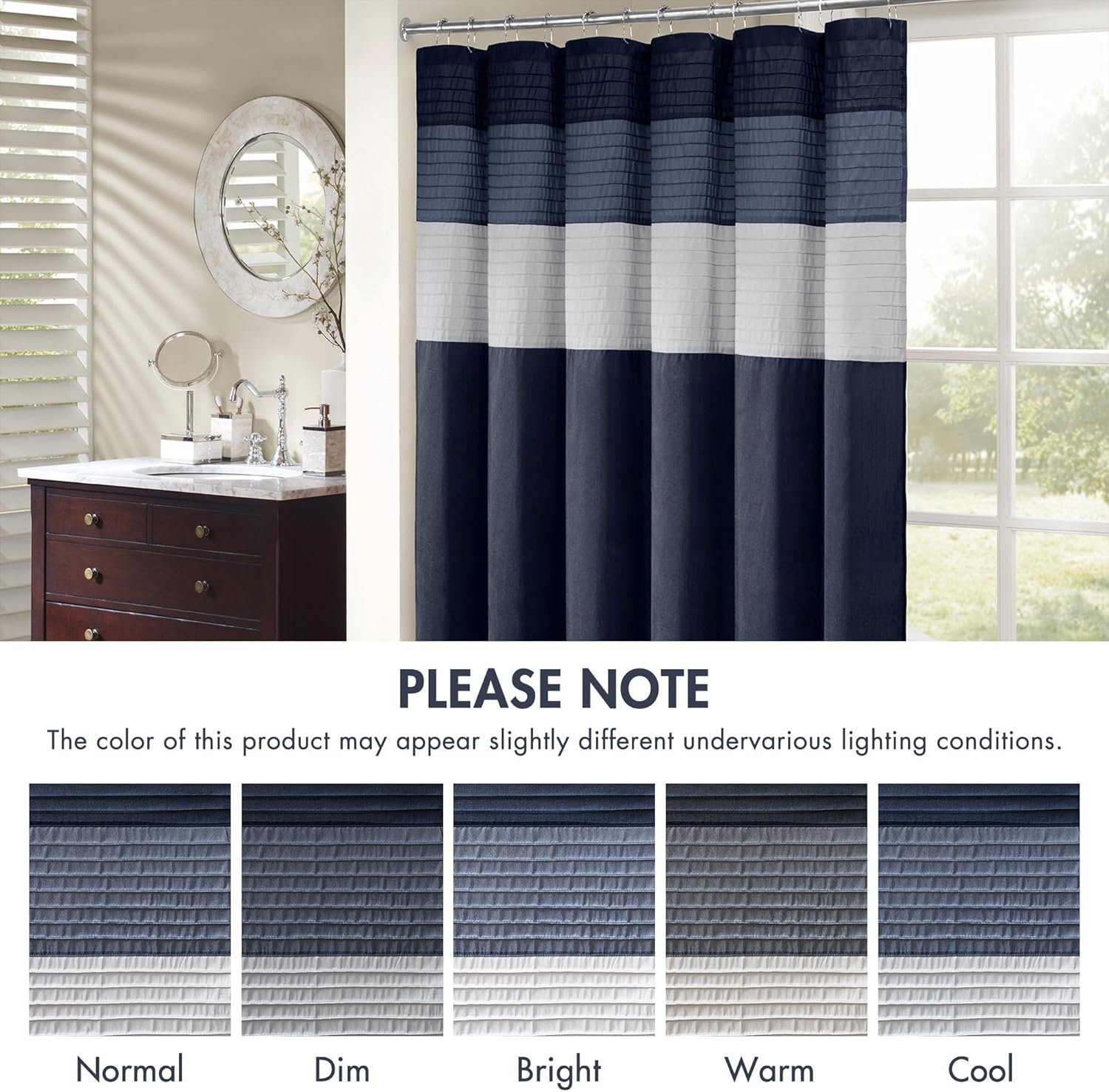 Upgrade your bathroom with the Madison Park Amherst Faux Silk Pieced Striped Shower Curtain, offering a classic, spa-like touch with its elegant pleated design and rich navy hues. Made from OEKO-TEX certified, machine-washable polyester, this modern microfiber curtain is easy to care for and free of harmful chemicals. Its hook-ready, versatile sizing fits any space, making it ideal for homes, dorms, or hotels. Trust Madison Park for a stylish, high-quality accessory backed by a 30-day satisfaction guarantee.