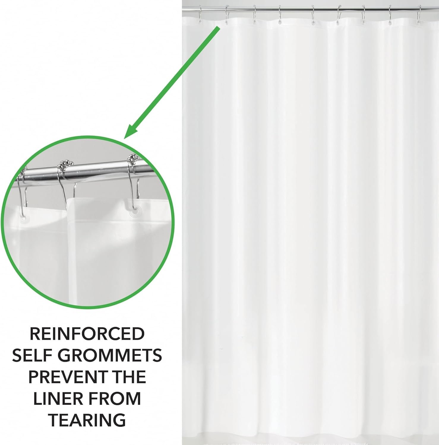 Thanks to its PEVA curtain material, this product avoids harsh chemicals, making it safer for families, kids, and pets. Many users also appreciate how the weighted bottom and reinforced grommets keep the liner stable, eliminating billowing during showers.